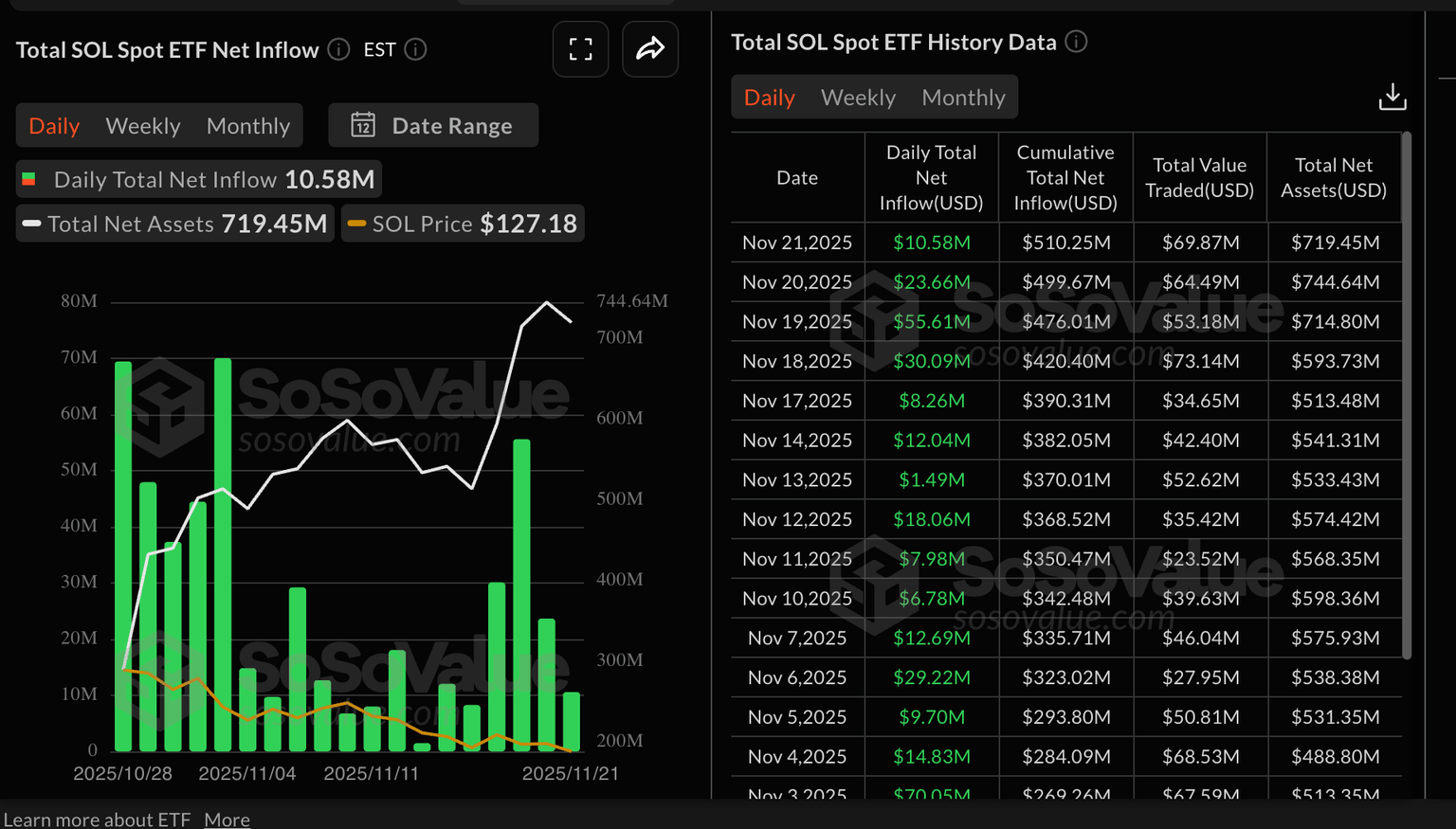 Los Fondos Cotizados en Bolsa (ETFs) de Solana listados en Estados Unidos (EE.UU.) mantuvieron su racha de entradas constantes, registrando casi 11 millones de dólares en entradas el viernes. Según SoSoValue, los ETFs de SOL tienen entradas netas acumulativas de aproximadamente 510 millones de dólares, con activos netos promediando 719 millones de dólares.