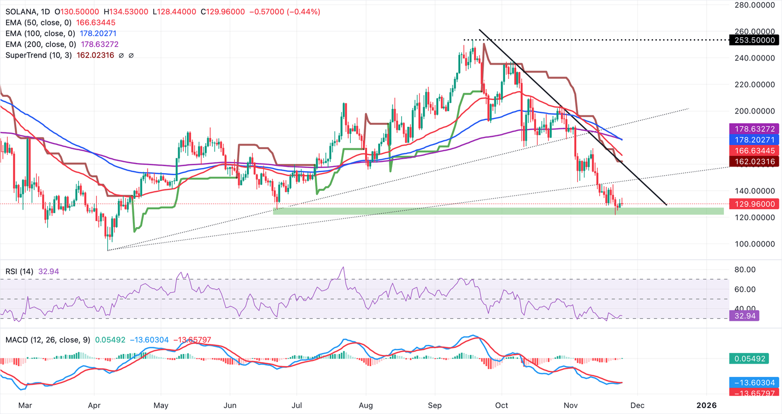 Solana está cotizando por debajo del obstáculo de número redondo de 130$ en el momento de escribir este artículo el lunes. El token también se mantiene por debajo de la media móvil exponencial (EMA) de 50 días en 166$, la EMA de 100 días en 178$ y la EMA de 200 días en 178$, que descienden y mantienen un sesgo bajista.