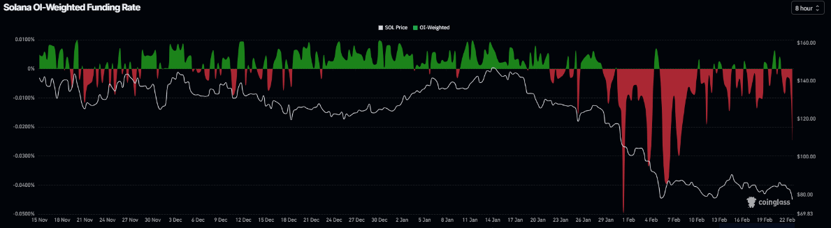 Además, las tasas de financiación para SOL también apoyan una perspectiva bajista. Los datos de CoinGlass muestran que la tasa de financiación de SOL se volvió negativa el sábado y actualmente se sitúa en -0.0245% el lunes, acercándose al nivel visto durante la caída del precio del 6 de febrero. Esta tasa negativa indica que las posiciones cortas están pagando a las posiciones largas y sugiere un sentimiento bajista.