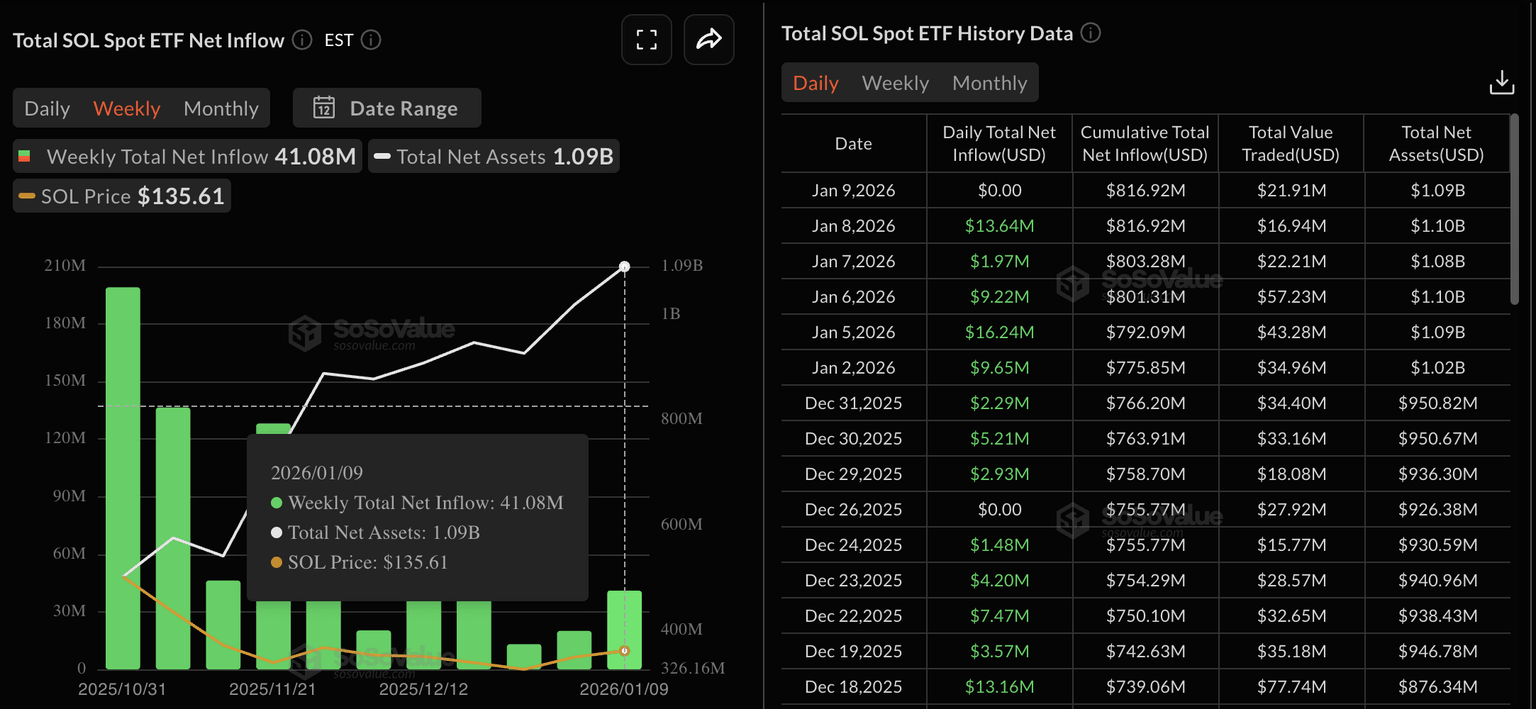 - Los ETF de SOL al contado en EE.UU. muestran un renovado interés institucional, con entradas totales de más de 41 millones de dólares la semana pasada.
