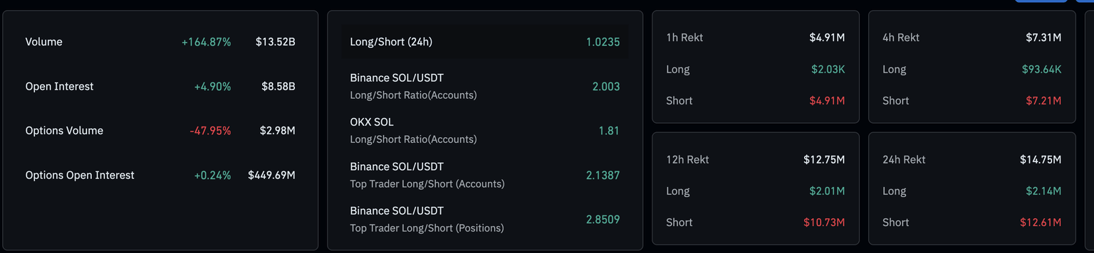 En el lado de los derivados, los flujos de capital hacia los futuros de Solana sugieren una demanda renovada por parte de los operadores. Los datos de CoinGlass muestran que el Interés Abierto (OI) de los futuros de SOL ha aumentado un 4,90% en las últimas 24 horas, alcanzando los 8.580 millones de dólares.