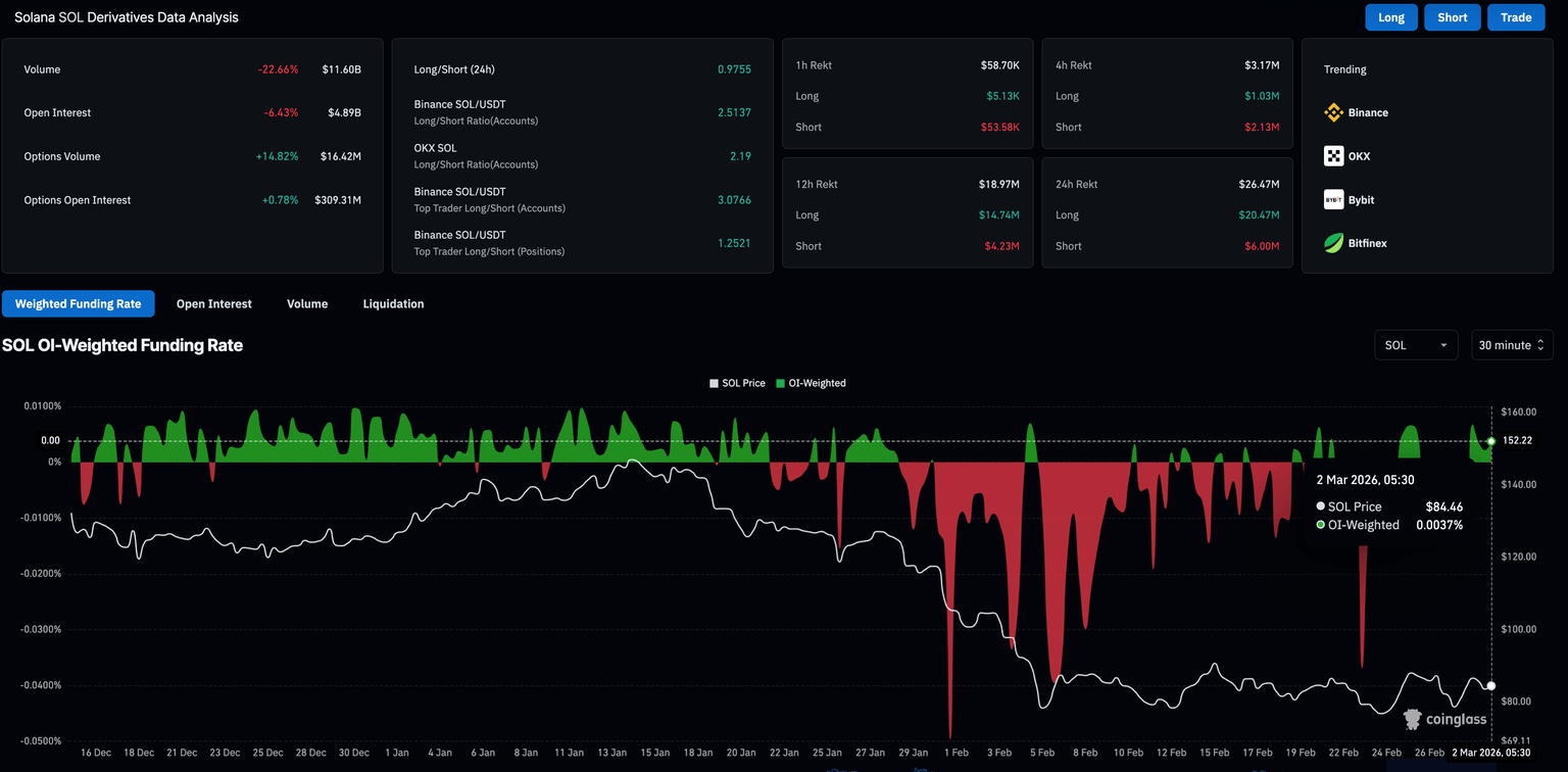 Sin embargo, el sentimiento minorista en el mercado de criptomonedas más amplio se desplaza hacia una aversión al riesgo en medio del conflicto en curso en Oriente Medio. Los datos de CoinGlass muestran que el interés abierto de futuros de SOL (OI) está en 4.89 mil millones de dólares el lunes, cayendo más del 6% en las últimas 24 horas, lo que sugiere una pérdida significativa de valor nocional de los contratos pendientes debido a la liquidación de posiciones. Corroborando esta liquidación de posiciones, las liquidaciones totales de 26.47 millones de dólares en el mismo período fueron lideradas por 20.47 millones de dólares en liquidaciones largas, sugiriendo una liquidación más amplia de posiciones alcistas.