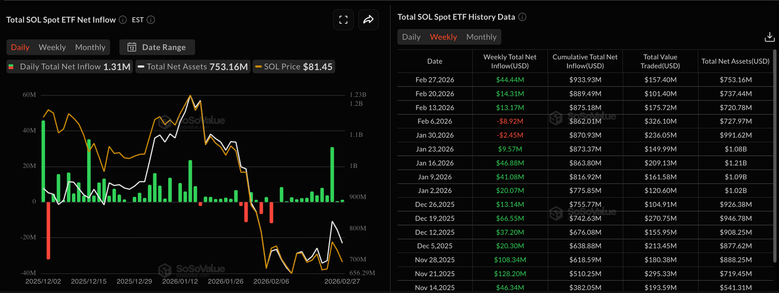 Solana recuperó el apoyo institucional la semana pasada, como lo demuestra el hecho de que los ETFs de SOL al contado en EE.UU. registraron 44.44 millones de dólares en entradas semanales, impulsados por 30.86 millones de dólares en entradas diarias el miércoles.