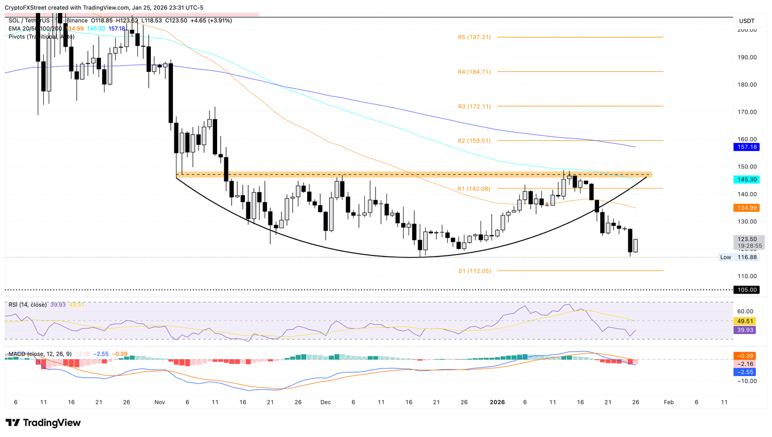 El panorama técnico para Solana se centra únicamente en el mínimo de diciembre en 117$ y el nivel de soporte psicológico de 100$ a medida que aumenta la presión de venta.