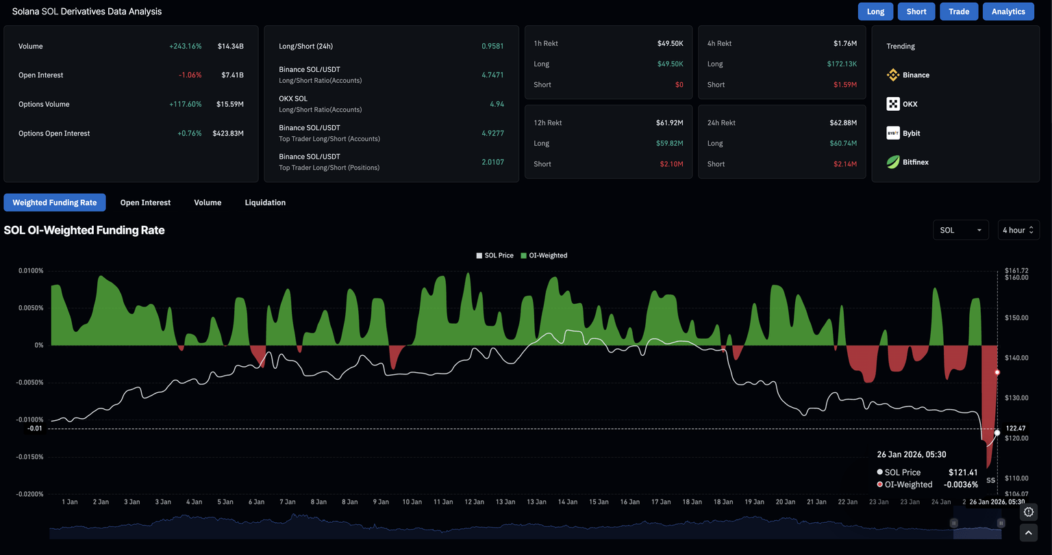 En el lado de los derivados, la demanda se suaviza a medida que las liquidaciones largas de más de 60 millones de dólares superan a las liquidaciones cortas de 2.14 millones de dólares en las últimas 24 horas, reafirmando el sesgo vendedor. El Interés Abierto (OI) de futuros de SOL ha bajado un 1% a 7.41 mil millones de dólares, indicando un valor reducido de contratos pendientes a medida que las posiciones alcistas son eliminadas y nuevas posiciones se inclinan a la baja, como lo evidencia la tasa de financiación negativa de -0.0036%.