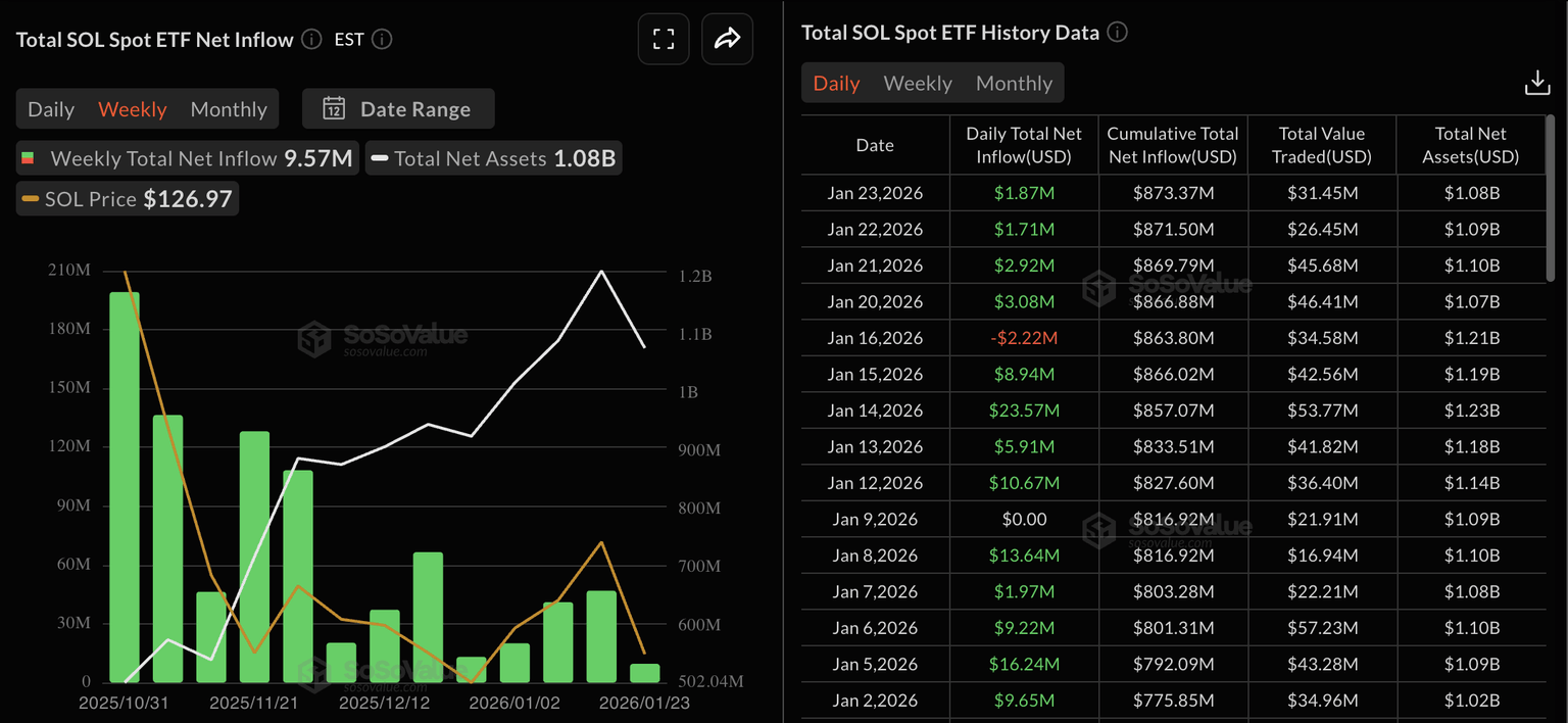 - La demanda institucional de Solana está disminuyendo a medida que los ETF SOL de EE.UU. registran su menor entrada semanal de 9.57 millones de dólares.