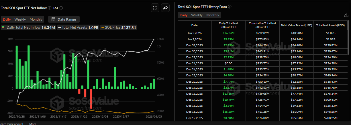 La demanda institucional por Solana ha seguido creciendo desde su lanzamiento el 28 de octubre. Los datos de SoSoValue muestran que los ETFs de Solana al contado registraron 16.24 millones de dólares en entradas el lunes, la mayor entrada en un solo día desde mediados de diciembre. Además, los activos netos totales superaron los 1.000 millones de dólares hasta ahora esta semana, lo que sugiere un aumento en la demanda institucional. Si las entradas continúan e intensifican, SOL podría ver un repunte en su precio.