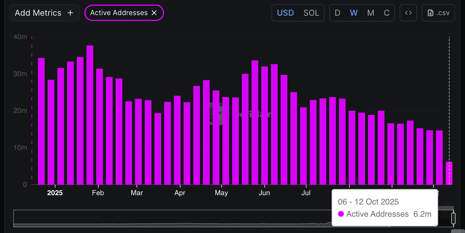 - La blockchain de Solana experimenta una disminución en las direcciones activas y transacciones en medio de una caída en la actividad en cadena.