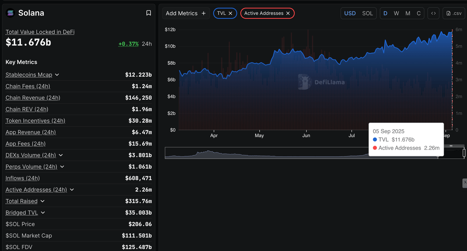 Los datos de DefiLlama muestran que la blockchain de Solana tiene un TVL de 11.67 mil millones de dólares, en comparación con los 9.86 mil millones de dólares registrados el 8 de agosto. En otras palabras, los inversores han bloqueado más de 1.8 mil millones de dólares en contratos inteligentes en el protocolo en un mes, subrayando su convicción en la capacidad de SOL para extender la tendencia alcista.