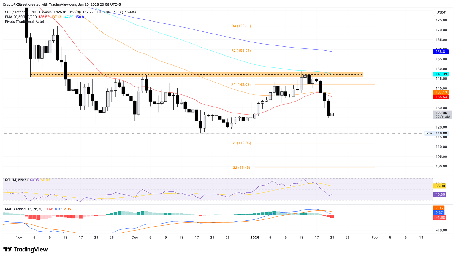 Los indicadores técnicos en el gráfico diario sugieren un fortalecimiento del momentum bajista para Solana. La línea de Convergencia/Divergencia de Medias Móviles (MACD) se extiende por debajo de la línea de señal roja hacia la línea cero, profundizando las barras de histograma negativas. El Índice de Fuerza Relativa (RSI) se sitúa en 41, por debajo de la línea media, reforzando el control de los vendedores.