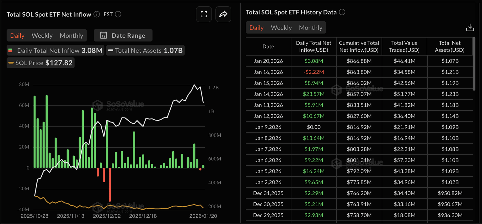- Los ETFs de Solana registraron una entrada neta de más de 3 millones de dólares el martes, sugiriendo un interés institucional constante.