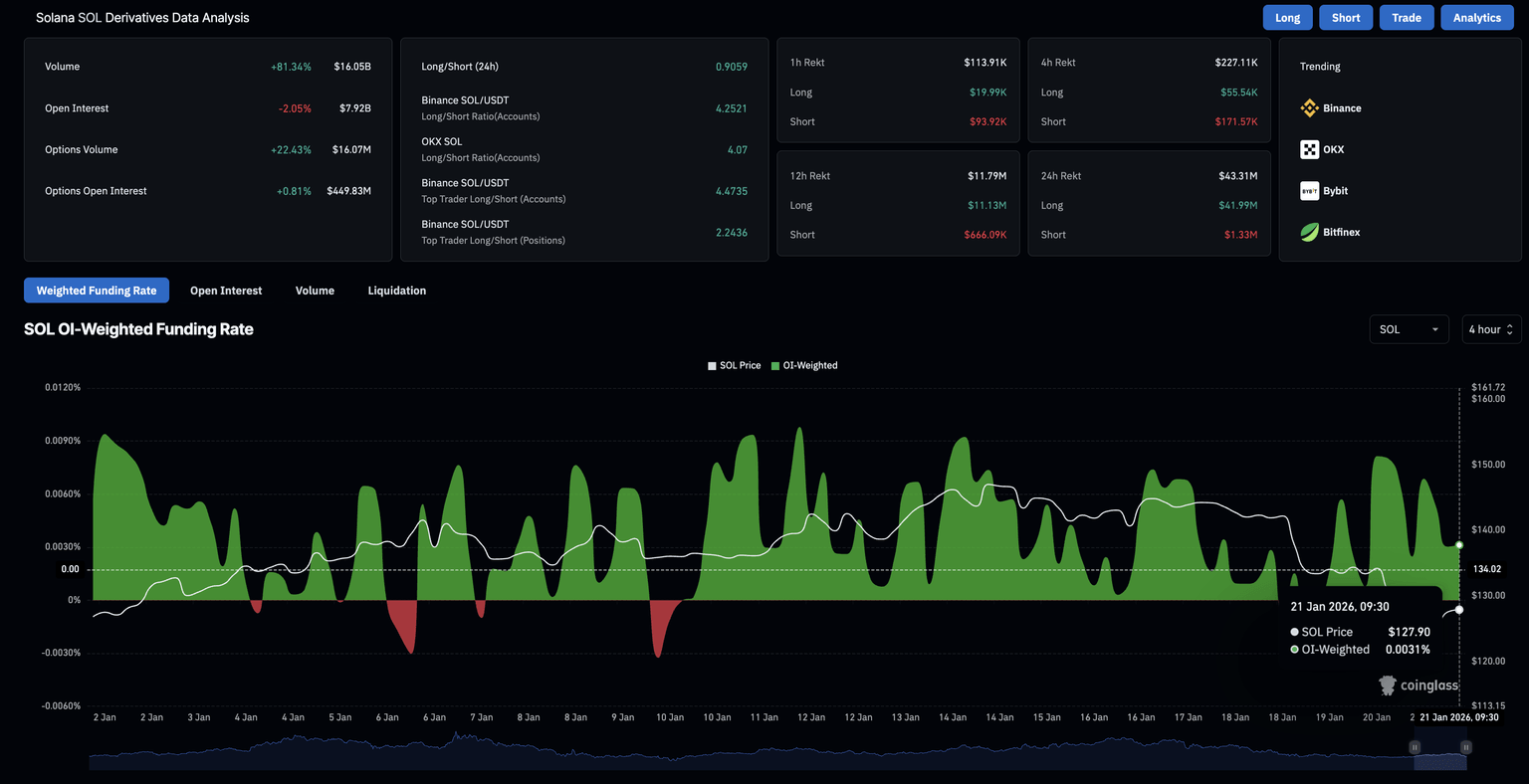 Mientras tanto, el interés abierto (OI) de Solana ha bajado un 2,05% en las últimas 24 horas, a 7.920 millones de dólares, reflejando una disminución significativa en el valor de los contratos de futuros pendientes, incluidos los apalancados. En línea con la reducción de capital, las liquidaciones largas de 41,99 millones de dólares en el mismo período superaron a las liquidaciones cortas de 1,33 millones de dólares, eliminando posiciones en general alineadas con el optimismo.