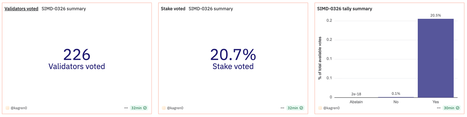 Los datos de Dune Analytics muestran que 226 validadores han votado, representando más del 20% de la participación de la red. La mayoría de los validadores (20.5% de la participación de la red) apoyan la actualización Alpenglow.