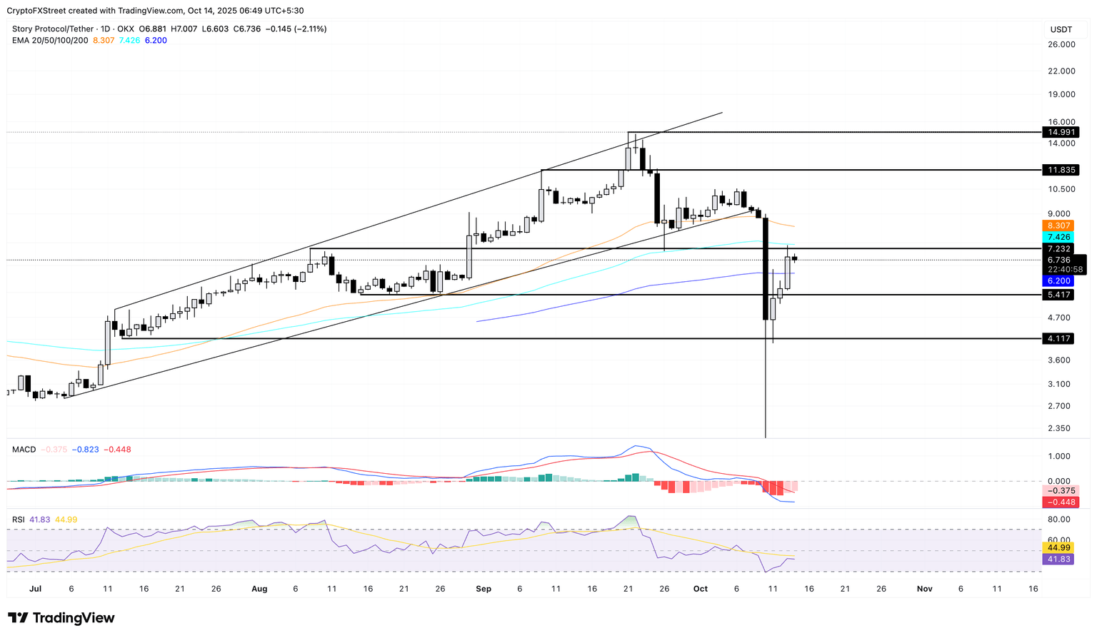 El token Story baja un 2% en el momento de la publicación el martes, tras tres días consecutivos de recuperación. IP enfrenta oposición en el nivel de 7.232$ cerca de la Media Móvil Exponencial (EMA) de 100 días, que anteriormente actuó como soporte el 26 de septiembre.