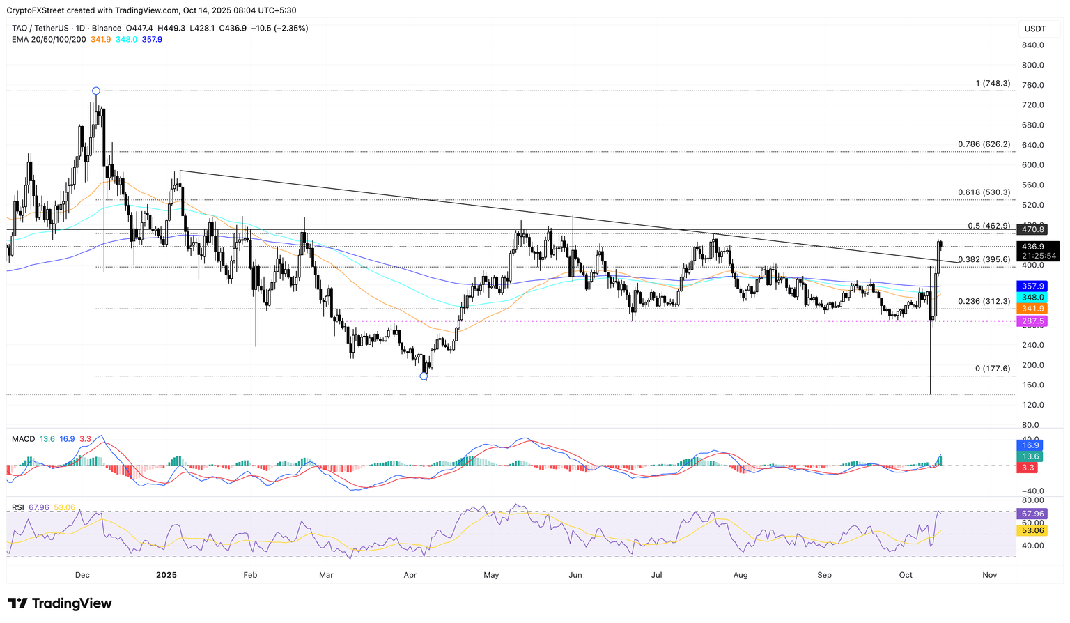 - El repunte de Bittensor prospera por encima de 400$, acercándose a un nivel crítico de resistencia de varios meses cerca de 462$.