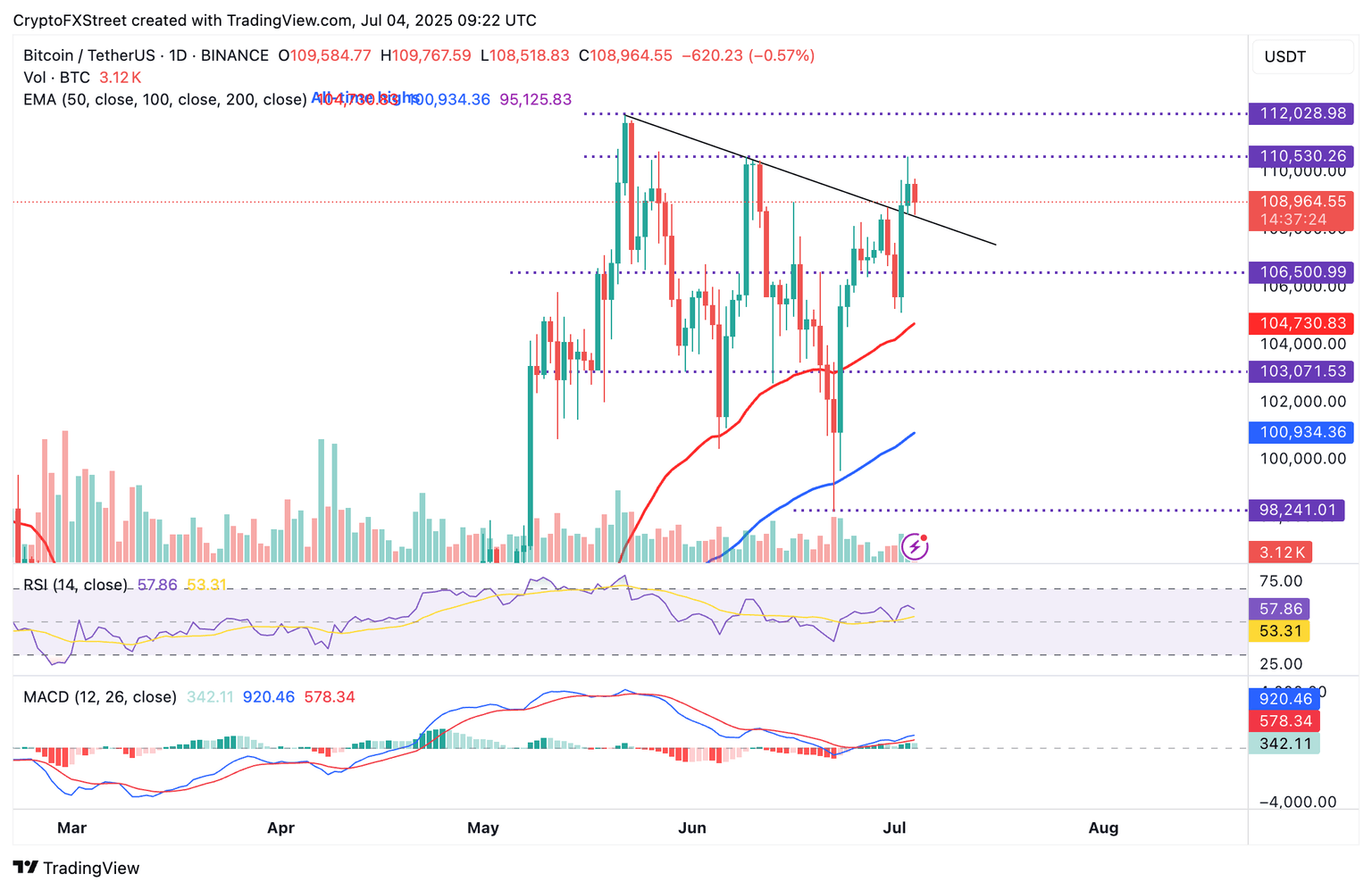 Técnicamente, la estructura de Bitcoin sigue siendo alcista, apoyada por encima de la línea de tendencia descendente recientemente rota. Una señal de compra del indicador de Convergencia/Divergencia de Medias Móviles (MACD) mantenida desde el 26 de junio podría impulsar el sentimiento de riesgo.