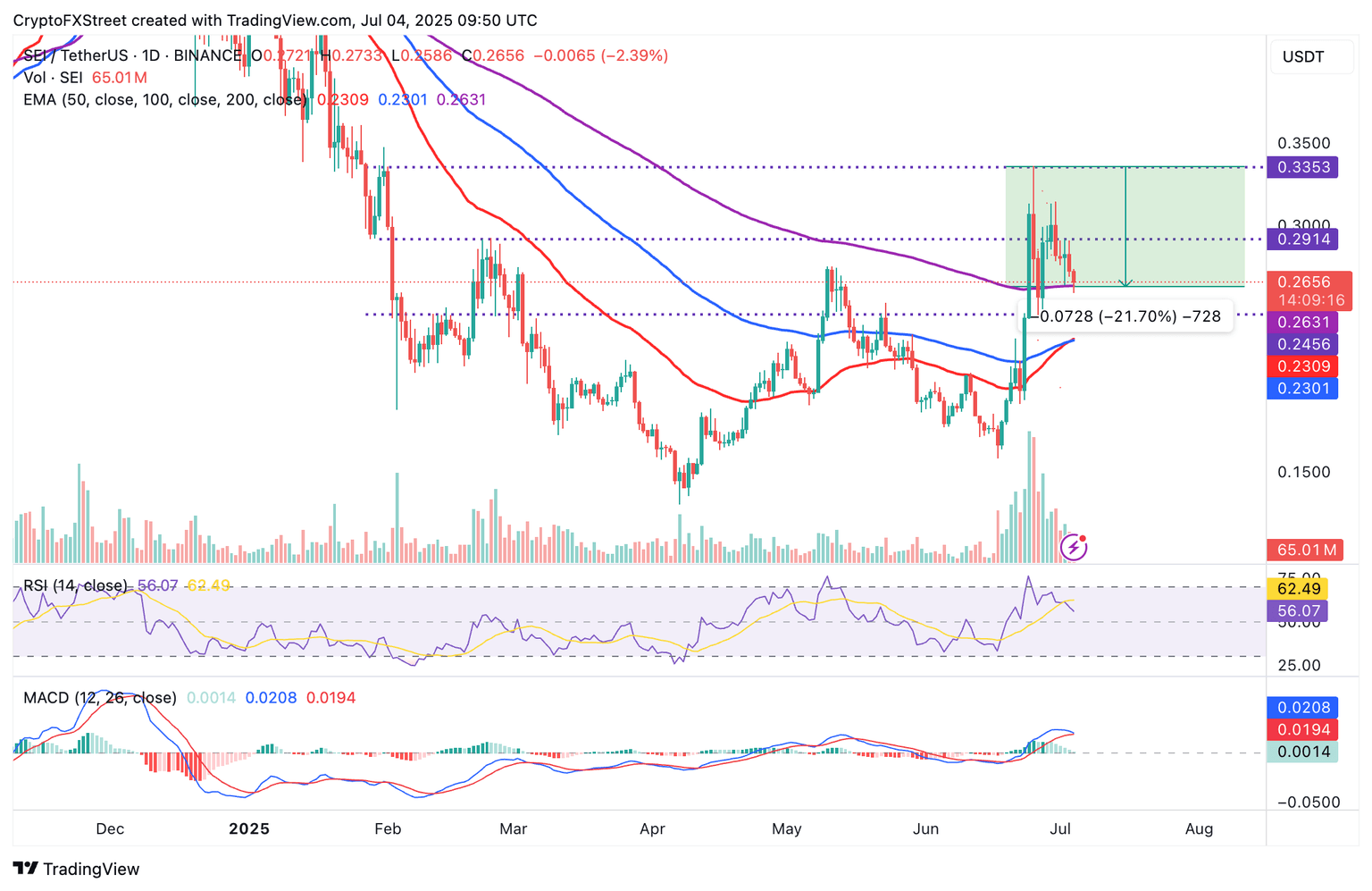- Sei extiende el retroceso en casi un 22% desde el pico de junio de 0.33$, ya que los indicadores técnicos clave ofrecen señales bajistas.