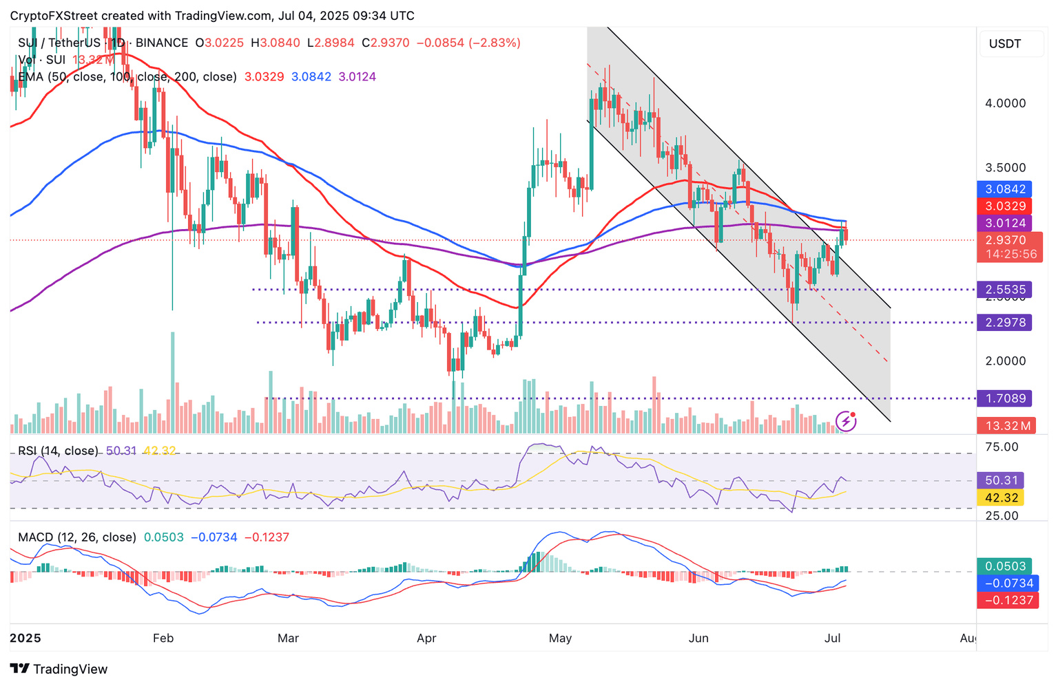 El precio de Sui ronda los 2.93$ en el momento de escribir, con una caída del 3% en el día. El token de Capa-1, diseñado para proporcionar un entorno de desarrollo seguro, robusto y escalable, actualmente cotiza por debajo de las medias móviles clave, incluyendo la EMA de 100 días en 3.08$, la EMA de 50 días en 3.03$, y la EMA de 200 días en 3.01$.