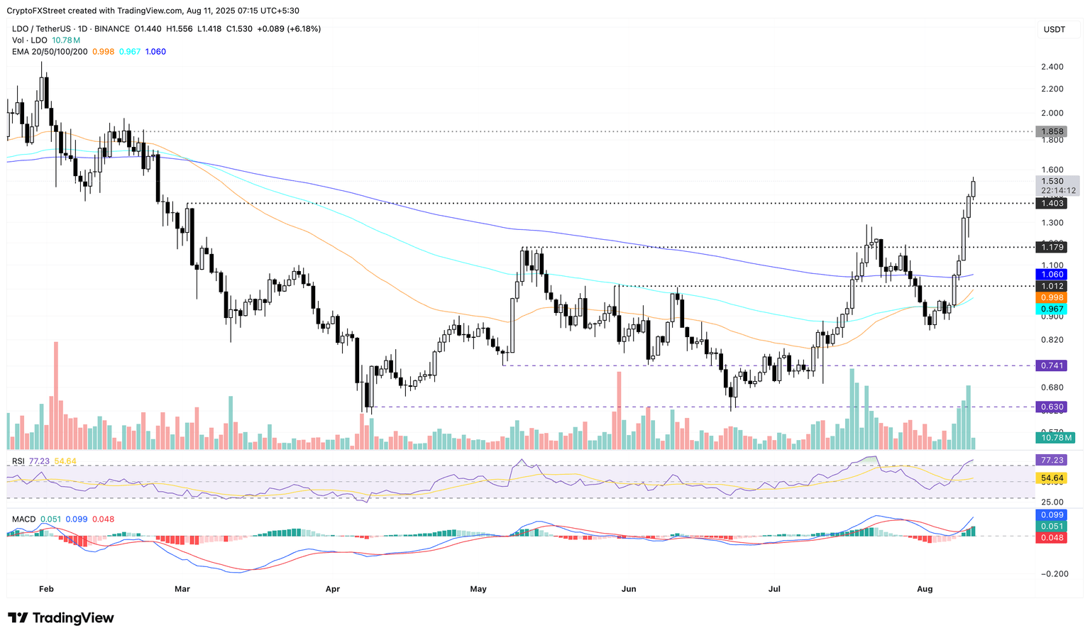 El token de Lido DAO ha apreciado más del 6% hasta ahora el lunes, superando la marca de 1.50$ para alcanzar un máximo de cinco meses. La carrera de recuperación en LDO, respaldada por un aumento del impulso alcista, es evidente en el RSI en 77, que ha alcanzado niveles de sobrecompra junto con las líneas de MACD y señal en tendencia ascendente.