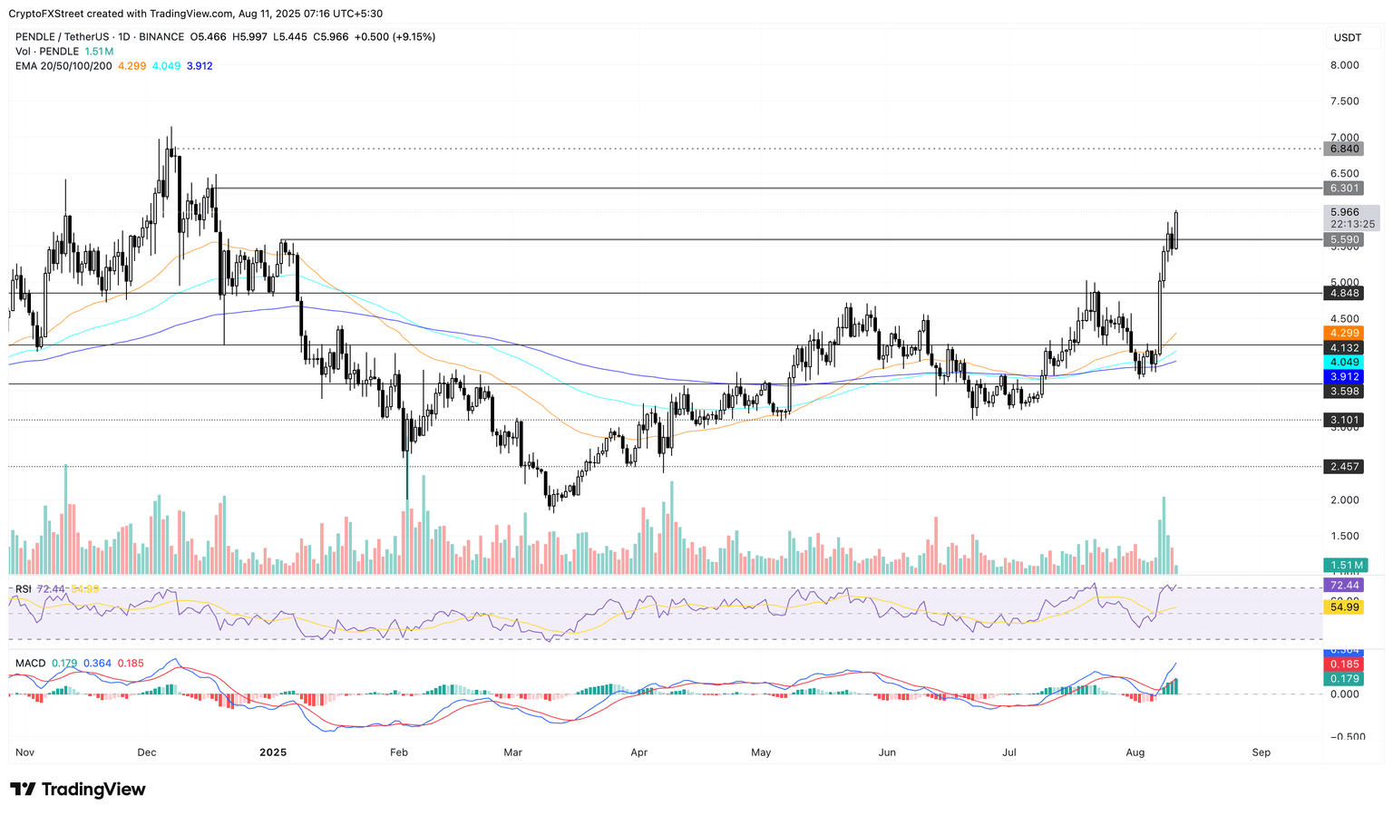 - Pendle salta más del 9% hasta ahora el lunes, con la vista en recuperar el nivel de 6.00$.
