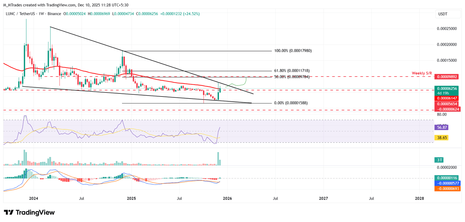 Si LUNC cierra por encima de la EMA de 50 semanas en 0.000056$ de manera semanal, podría extender el repunte hacia la próxima resistencia semanal en 0.000098$.