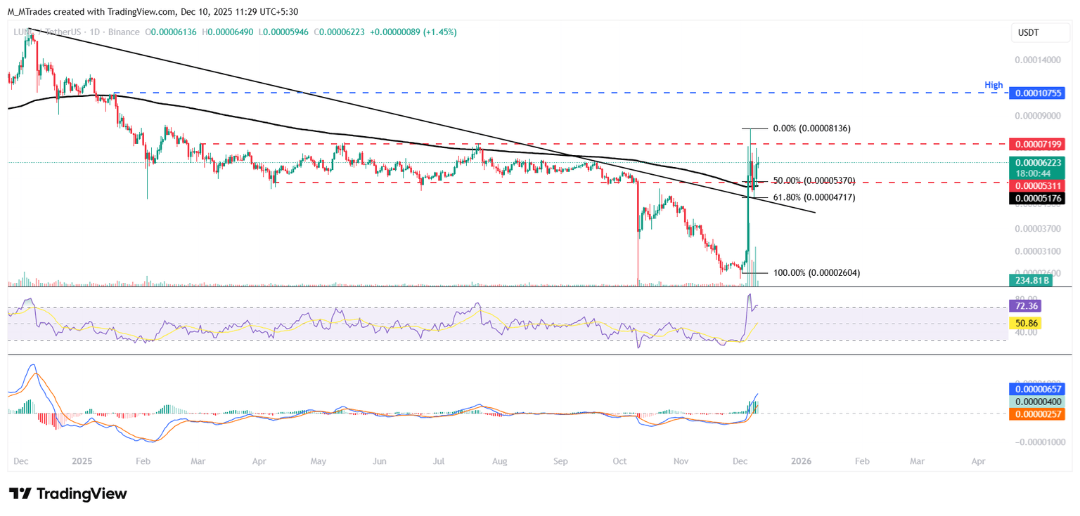 - El panorama técnico sugiere un mayor potencial alcista, con LUNC apuntando a una posible continuación del repunte hacia 0.000081$ y más allá.