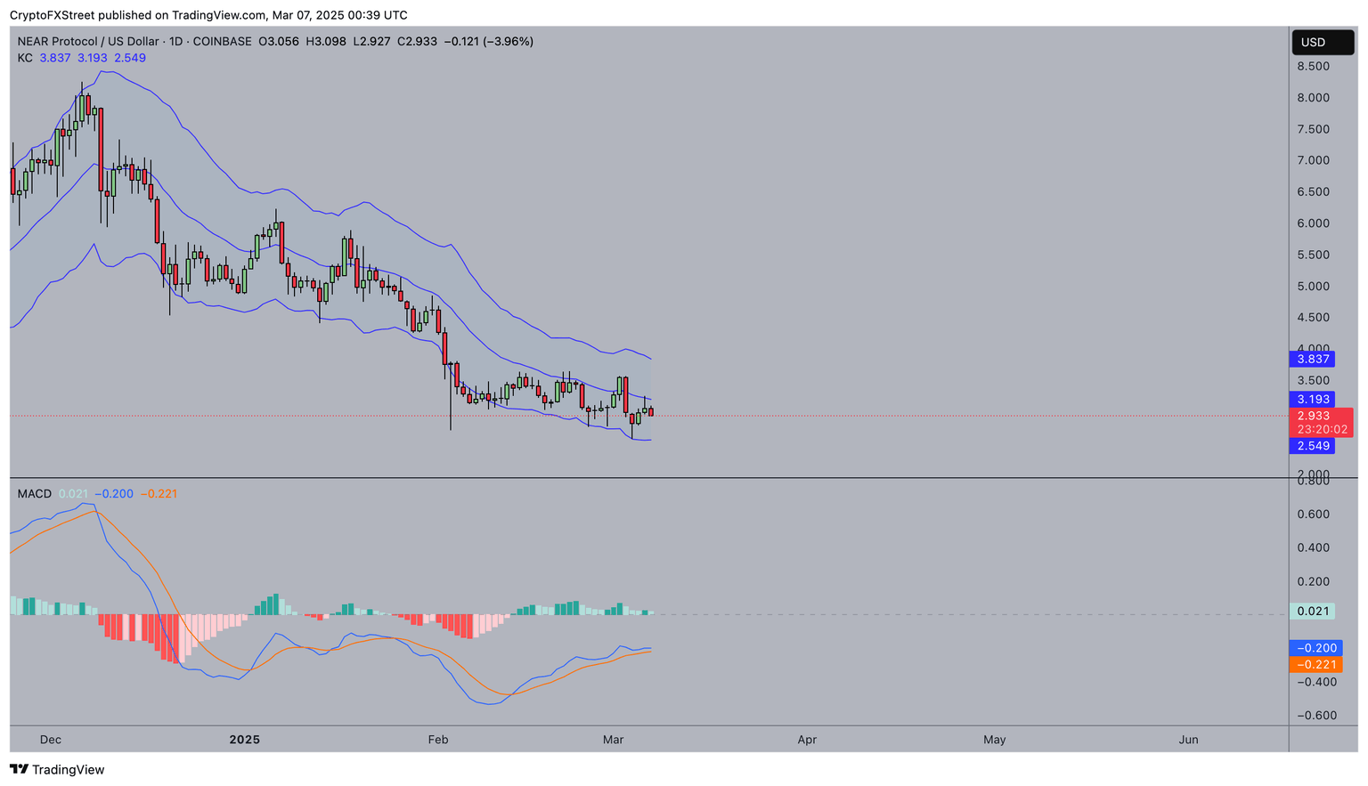 El precio de NEAR está intentando un giro alcista mientras encuentra estabilidad cerca de 2.93$, tras una prolongada tendencia bajista. El Canal de Keltner (KC) sugiere compresión de volatilidad, con el precio abrazando la banda inferior cerca de 2.55$, insinuando un estado de sobreventa. Si los alcistas toman el control, una ruptura hacia la línea media del KC en 3.19$ podría materializarse, con un empuje extendido hacia el límite superior en 3.83$.