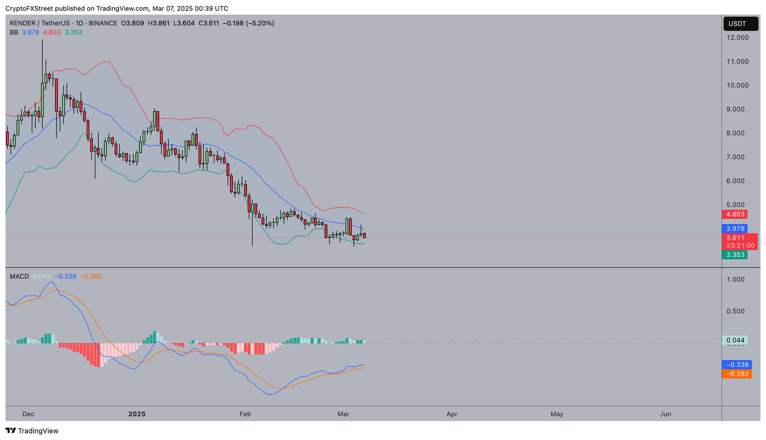 Un breakout alcista por encima de la banda media en 3.97$ podría enviar a RNDR hacia la resistencia superior de 4.60$, mientras que la incapacidad de mantener el soporte actual podría abrir un camino hacia 3.35$.