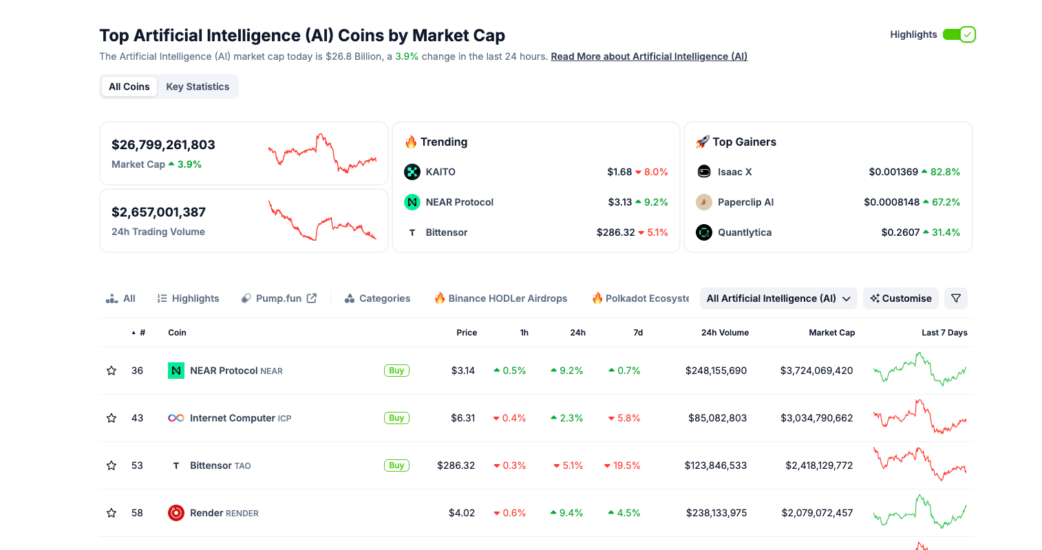 El sector de las criptomonedas está experimentando un notable impulso, con los tokens de inteligencia artificial (IA) liderando la carga. En 24 horas, la capitalización de mercado de las criptomonedas relacionadas con la IA ha aumentado un 3.9% hasta los 26.8 mil millones de dólares, añadiendo más de 700 millones de dólares y superando el crecimiento del 6.2% del mercado global de criptomonedas.