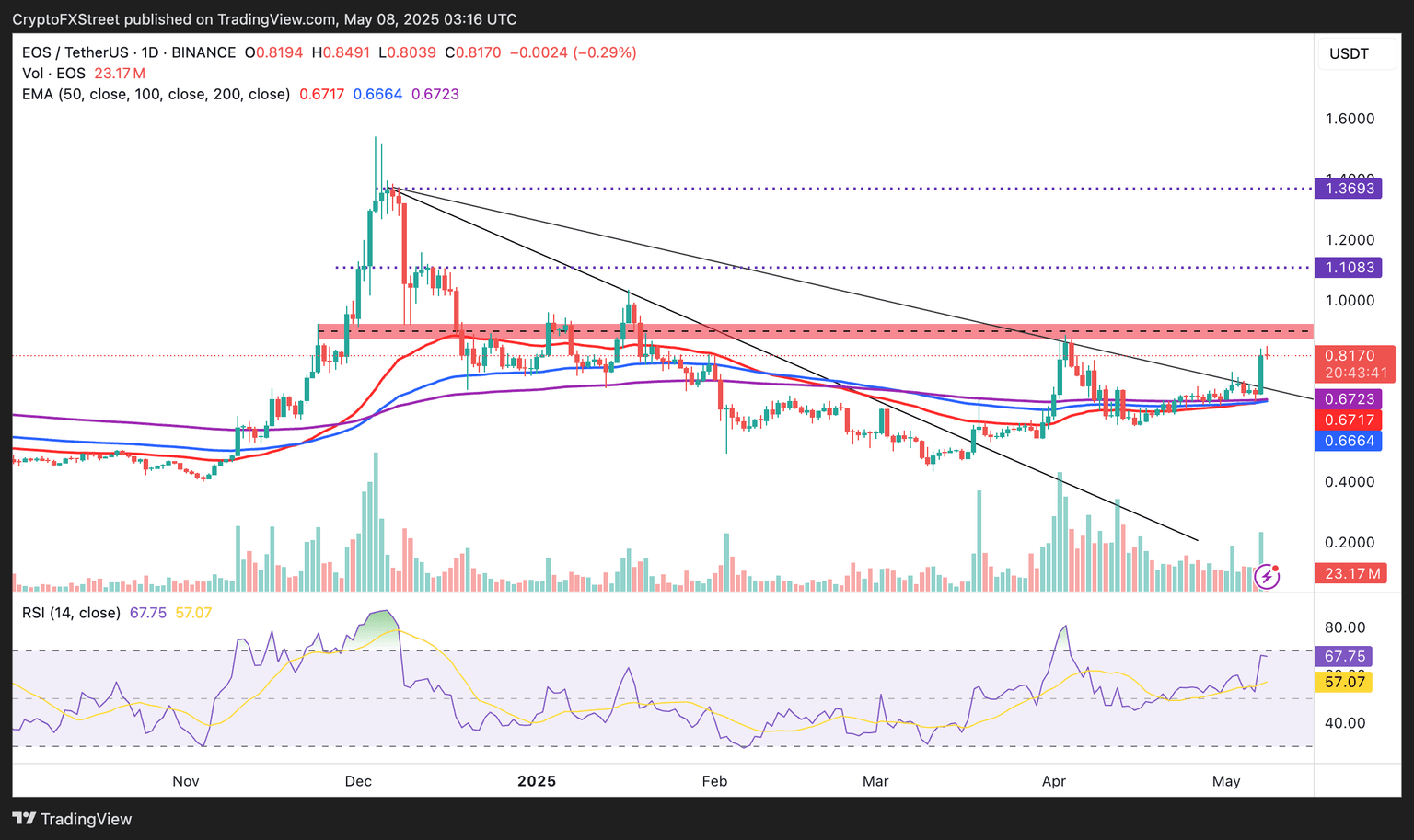 Mientras tanto, EOS está ganando impulso alcista, cotizando a 0.81$ en el momento de escribir, antes del intercambio al nuevo token A de la red. La tendencia alcista parece constante por encima de un soporte de confluencia importante alrededor de 0.67$ formado por las EMAs de 50 días, 100 días y 200 días.