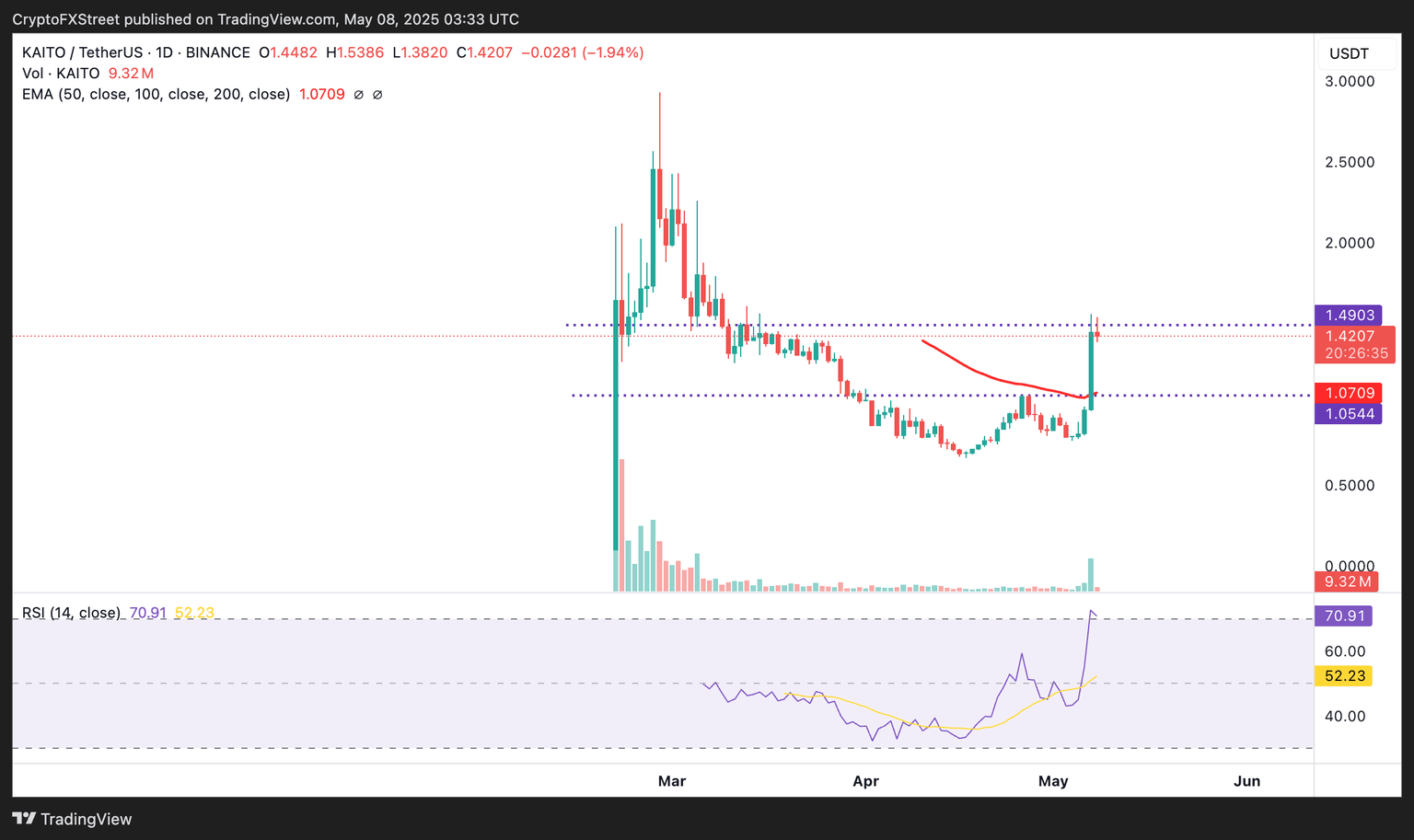 El precio de Kaito se intercambia a 1.41$ en el momento de escribir, bajando más del 2% en el día. Los operadores podrían ajustar sus portafolios considerando el Índice de Fuerza Relativa (RSI) ligeramente sobrecomprado en 70.