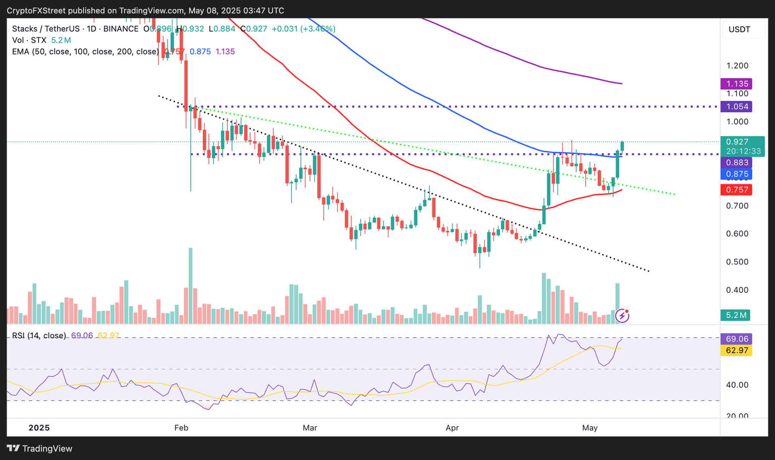 Los indicadores de momentum como el RSI revelan que los alcistas tienen la ventaja y es probable que empujen a STX por encima de la resistencia de 1.00$ en las próximas sesiones.