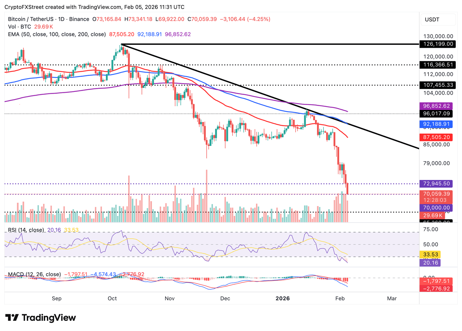 El precio del Bitcoin (BTC) cae por debajo de 70.000$ el jueves, habiendo corregido casi un 20% en lo que va del año. El impulso del mercado se ha vuelto extremadamente bajista, con indicadores técnicos apuntando a un mayor descenso hacia el siguiente soporte clave en 65.000$.