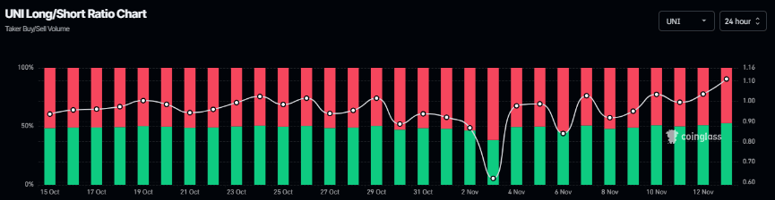 En el lado de los derivados, la relación larga-corta de Coinglass para UNI es de 1.10 el jueves, el nivel más alto en más de un mes. La relación por encima de uno sugiere que más operadores están apostando a que el precio de Uniswap suba.