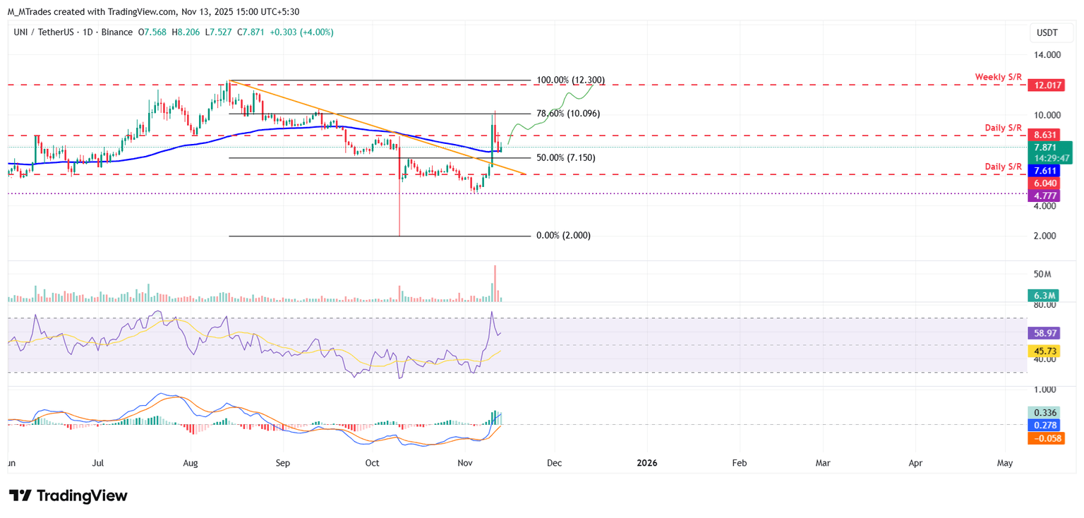 Sin embargo, el precio de UNI se ha retrocedido casi un 20% desde el fuerte aumento del lunes, con el token ahora encontrando soporte y estabilizándose por encima del nivel de 7.86$ el jueves, lo que sugiere una posible pausa antes de la próxima fase alcista.