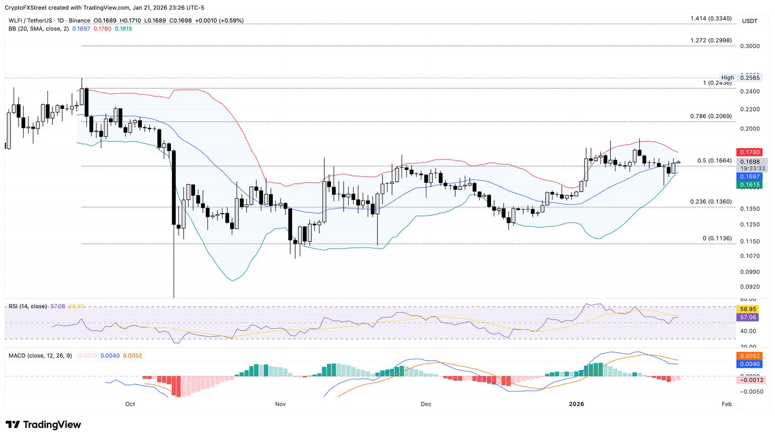 El token WLFI se negocia cerca de 0.1700$ en el momento de la prensa el jueves, subiendo por encima del nivel de retroceso del 50% en 0.1664$, medido desde los precios de cierre del 21 de septiembre y del 4 de noviembre de 0.2436$ y 0.1136$, respectivamente.