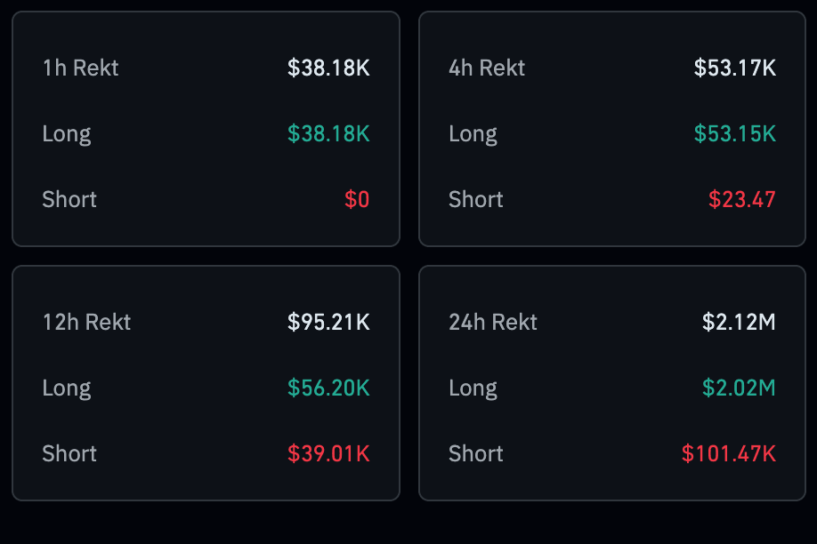 El posterior aumento en las liquidaciones, que asciende a 2.12 millones de dólares en las últimas 24 horas, con los titulares de posiciones largas soportando la mayor carga con 2 millones de dólares, subraya el impulso bajista.