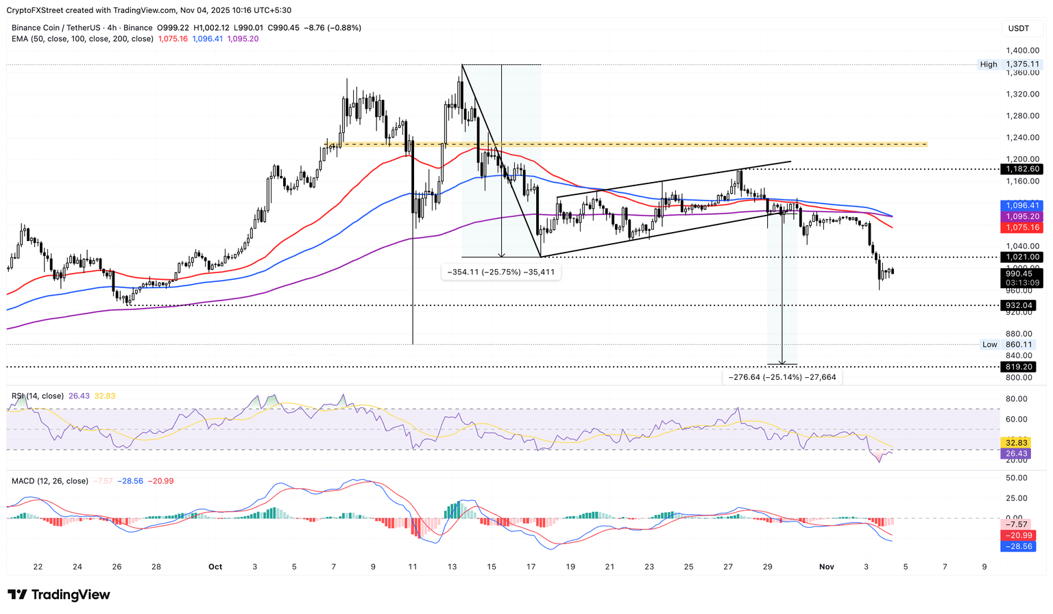 BNB extiende la ruptura a la baja de un patrón de bandera bajista en el gráfico de 4 horas, mencionado anteriormente por FXStreet. En el momento de escribir, BNB cotiza por debajo de 1.000$ el martes tras la caída del 8% el día anterior.