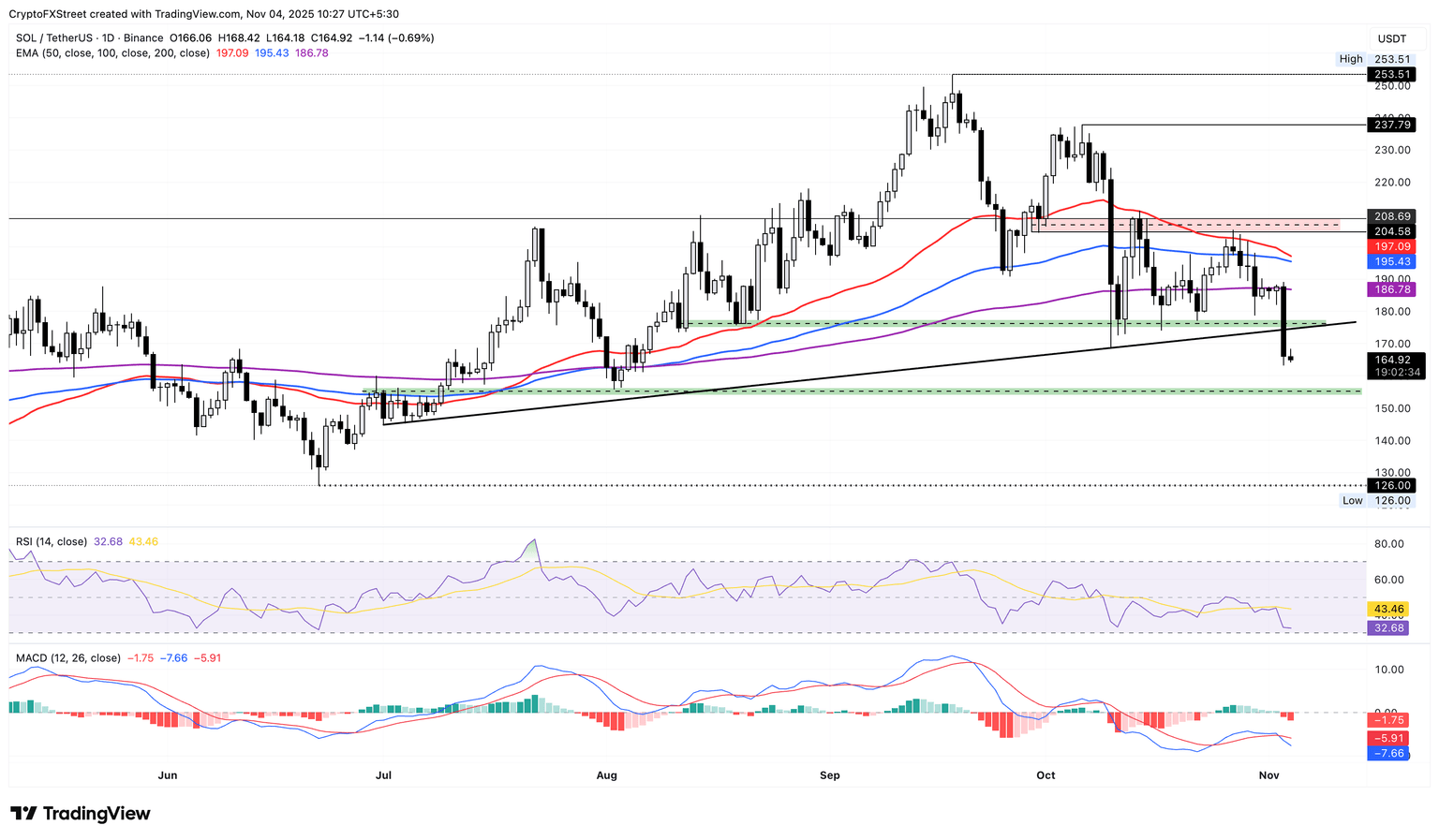 - La caída del 10% de Solana el lunes rompe por debajo de la zona de soporte clave y la línea de tendencia, a pesar de fuertes entradas de ETF.