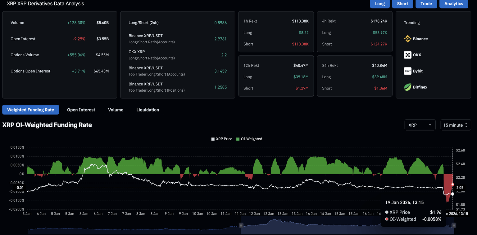 Los datos de CoinGlass muestran una caída de más del 9% en el Interés Abierto (OI) de futuros de XRP en las últimas 24 horas, hasta 3.55 mil millones de dólares. La reducción del OI refleja la aversión al riesgo entre los operadores, ya sea cerrando posiciones o reduciendo el apalancamiento.