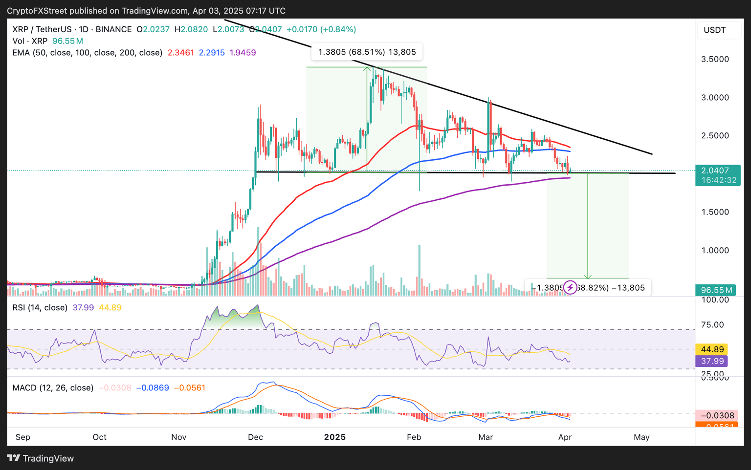 XRP está volviendo a probar el soporte de $2 en medio de una persistente venta por parte de los traders que buscan reducir su exposición a activos criptográficos en medio de la creciente incertidumbre comercial global mientras Trump promulga aranceles recíprocos. Es importante destacar que un triángulo descendente en el gráfico diario señala una posible caída del 68% hasta 0.62$ si se rompe el nivel de soporte inmediato de $2.