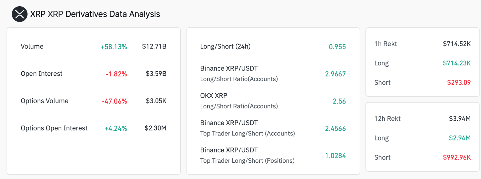 XRP extendió la corrección, probando el soporte de $2 el jueves, mientras causaba liquidaciones de 3.94 millones de dólares en posiciones largas y cortas en las últimas 24 horas, según datos de Coinglass. Un total de 2.94 millones de dólares en posiciones largas fueron cerradas forzosamente, además de 993k en cortas.