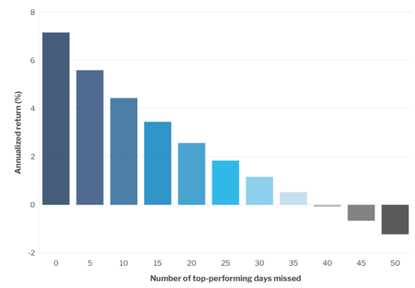 La parte pragmática de mi razonamiento es que sigo pensando que la incertidumbre en torno al comercio global y los aranceles provocará una ralentización del crecimiento y un aumento de la inflación, y que es probable que experimentemos ventas masivas en los mercados. Sin embargo, espero que cualquier deterioro de los fundamentales sea más bien lento. Para los inversores, este es un punto importante: estar fuera de los mercados tiene un coste de oportunidad, mientras que los sólidos beneficios y rendimientos de las empresas se acumulan a lo largo del tiempo a pesar de un panorama fundamental algo peor. El gráfico 1 subraya el hecho de que, incluso si los inversores son lo bastante inteligentes como para salir de los mercados antes de que se produzcan ventas, el riesgo de perderse sólo algunos de los días de mejores resultados en el rebote puede resultar costoso.