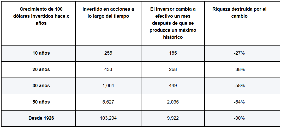 Vender acciones cada vez que el mercado alcanzaba máximos históricos habría destruido el 90% de su riqueza a muy largo plazo.