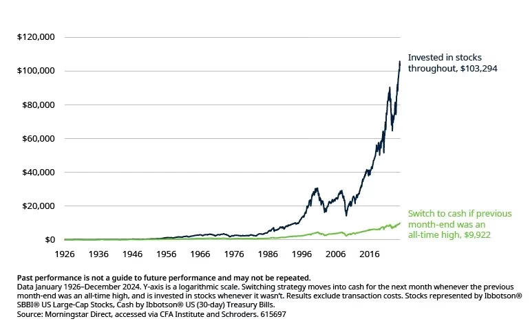 Datos de enero de 1926 a diciembre de 2024. El eje Y es una escala logarítmica. La estrategia de cambio pasa a efectivo para el mes siguiente siempre que el cierre del mes anterior haya sido un máximo histórico, y se invierte en acciones cuando no lo ha sido. Los resultados excluyen los costes de transacción. Las acciones están representadas por Ibbotson® SBBI® US Large-Cap Stocks, y el efectivo por Ibbotson® US (30 días) Treasury Bills. Fuente: Morningstar Direct, consultado a través del CFA Institute y Schroders.