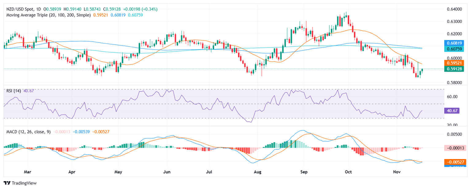 El NZD/USD subió un 0.31% a 0.5910 en la sesión del martes, continuando su recuperación mientras los compradores ganaron más terreno y rechazaron los intentos de los vendedores. Indicadores como el Índice de Fuerza Relativa (RSI) y el Promedio Móvil de Convergencia/Divergencia (MACD) continúan recuperándose, señalando un impulso mixto.