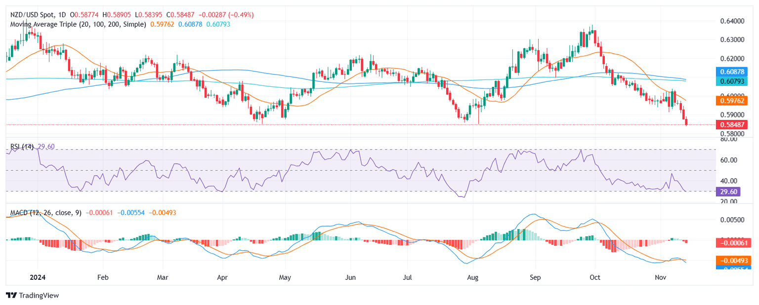 El par NZD/USD cayó un 0,65% durante la sesión del jueves y cayó por debajo de la marca de 0.5900, extendiendo las caídas por sexto día y alcanzando mínimos desde noviembre de 2023. El impulso bajista se intensificó y surgieron señales de sobreventa.