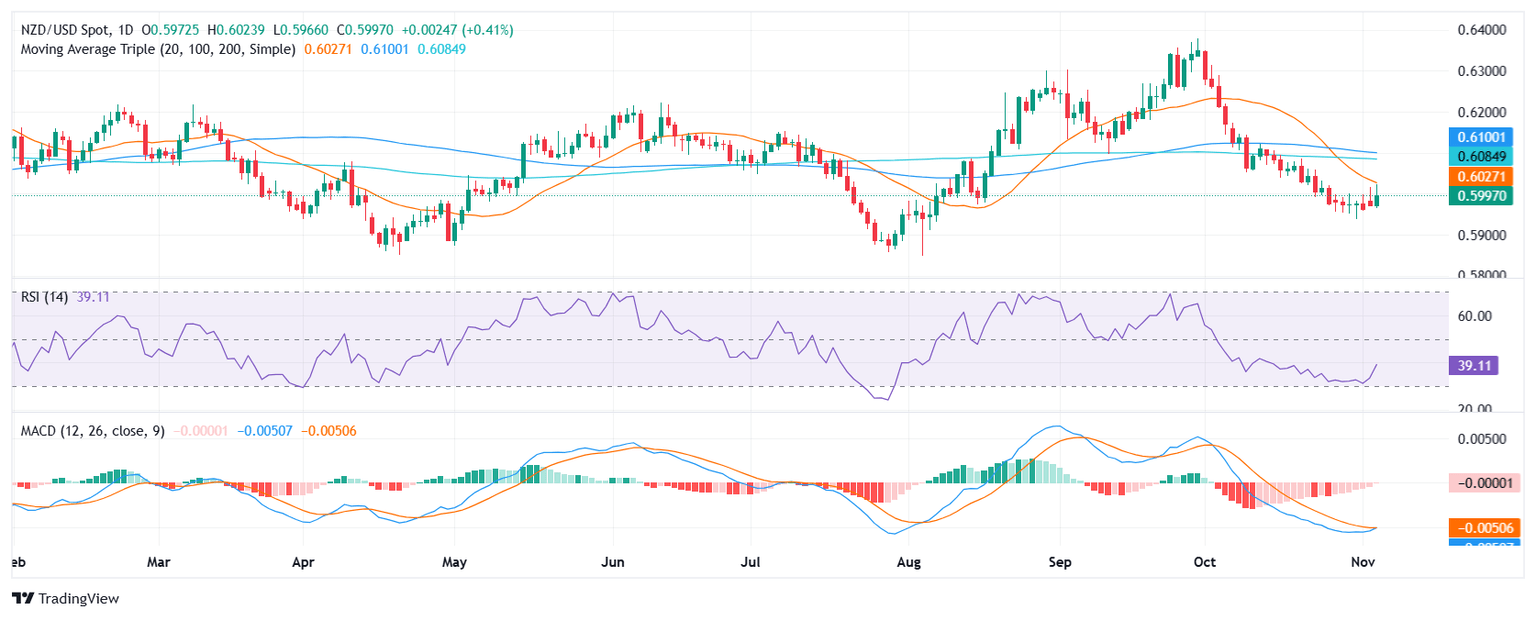 El par NZD/USD ha reanudado su movimiento errático, con un sesgo alcista, después de una breve caída por debajo del soporte de 0.6000. El par está cotizando actualmente alrededor de 0.5994, enfrentando resistencia en la media móvil simple (SMA) de 20 periodos, que ha limitado mayores ganancias en las sesiones recientes.