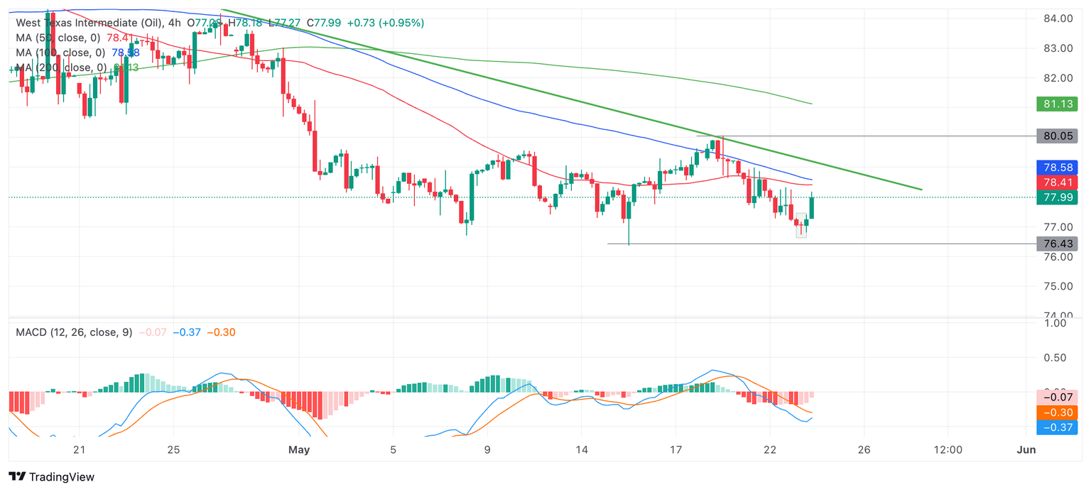 Sin embargo, el petróleo WTI está mostrando señales de reversión alcista. Formó una vela japonesa Doji en los mínimos de 76.74$ del jueves (rectángulo sombreado). A esto le siguieron dos velas alcistas consecutivas. Aunque es demasiado pronto para asegurarlo, la formación de velas japonesas podría indicar un cambio de tendencia a corto plazo.