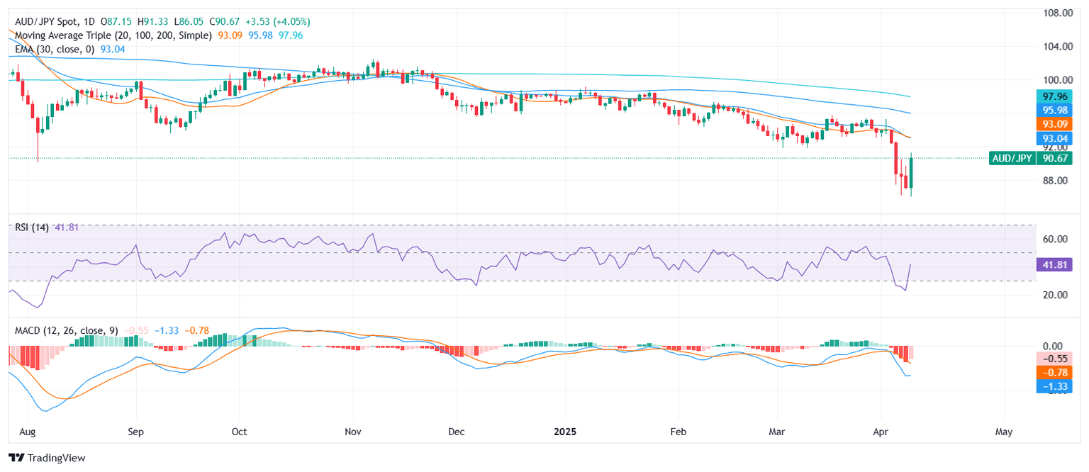 El par AUD/JPY protagonizó un fuerte rebote en la sesión del miércoles antes de la apertura asiática, subiendo hacia la zona de 91.00 tras aumentar más del 4% durante el día. A pesar del agresivo rebote intradía, los indicadores técnicos y las medias móviles continúan emitiendo señales bajistas, insinuando un riesgo a la baja persistente incluso cuando el momentum a corto plazo se vuelve positivo.